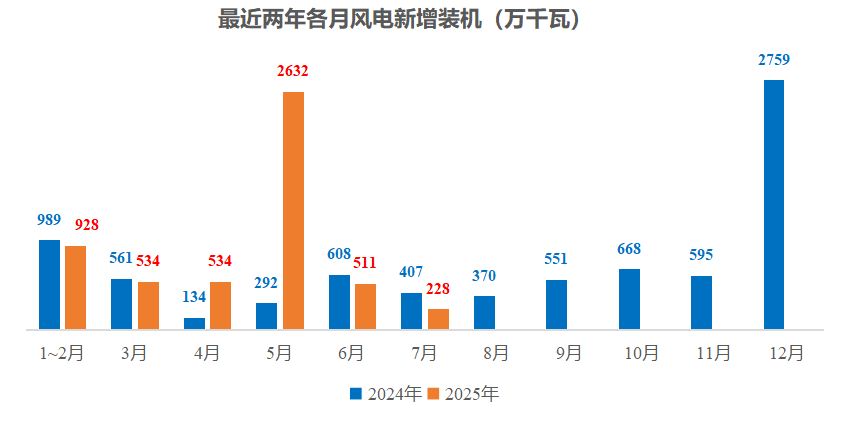 根据2025年6月份数据计算可得,2025年7月,全国新增光伏装机11.04GW,同比下降48%;新增风电装机2.28GW,同比下降44%。