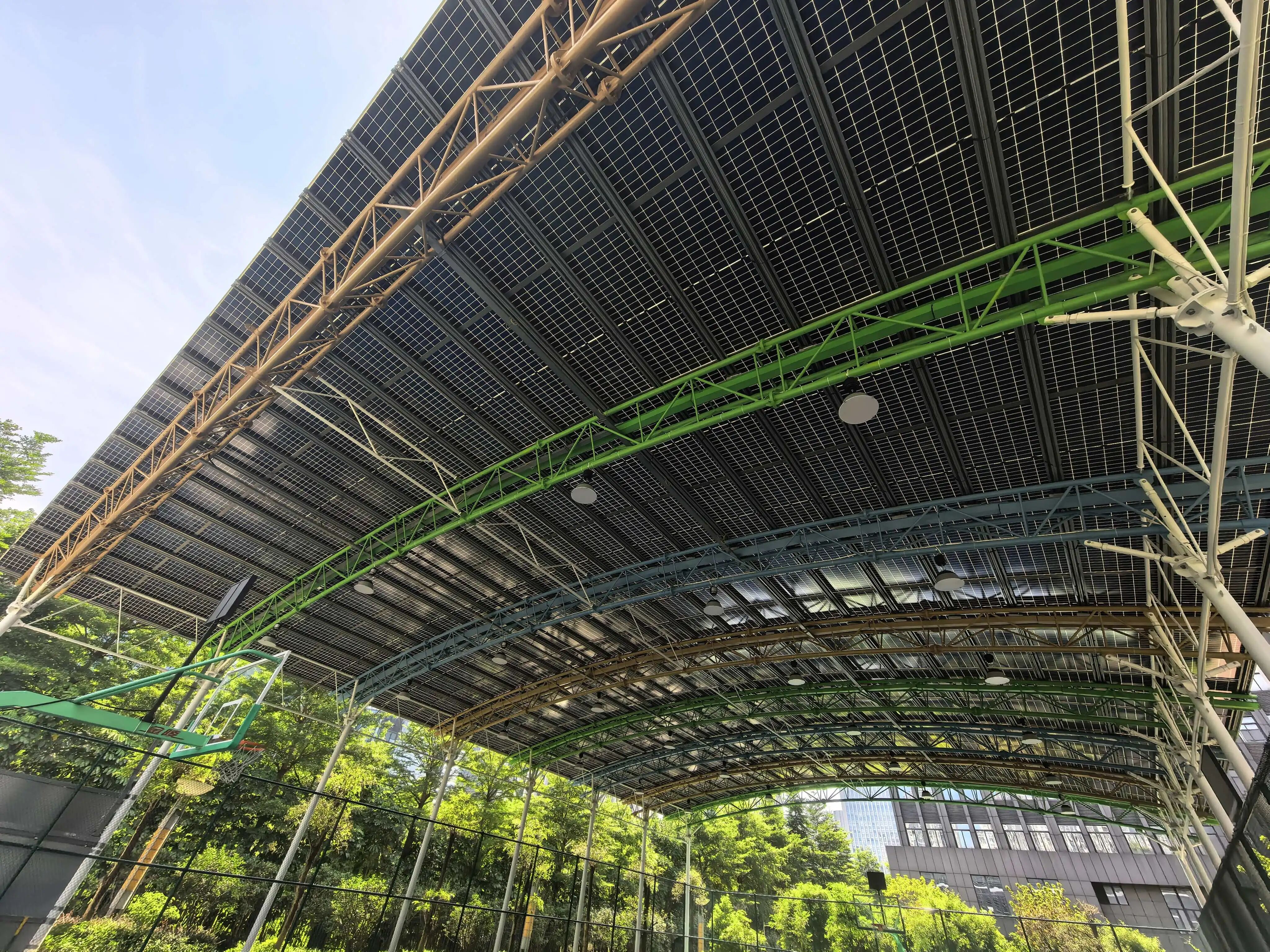 期间,永福绿能相关技术人员向参观学员详细介绍运维监控系统,细化讲解永福绿能在不同场景的解决方案,并带领学员参观永福绿能光伏篮球场示范项目,实地进行方案讲解。
