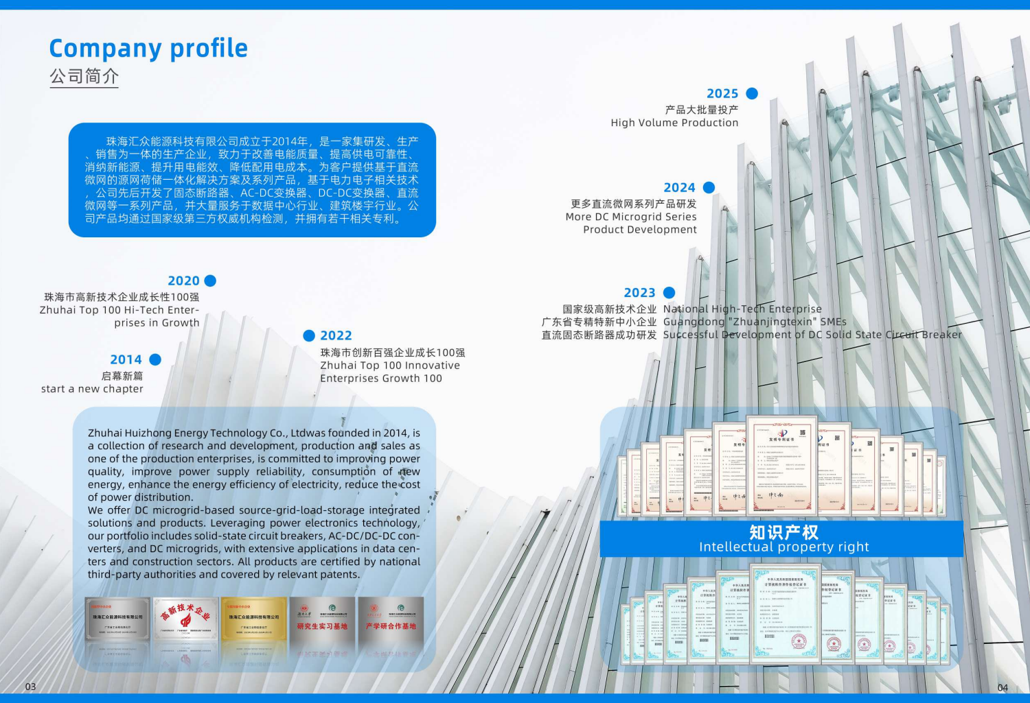 基于电力电子相关技术,公司先后开发了固态断路器、AC-DC变流器、DC-DC变流器、直流微网等一系列产品,并大量服务于数据中心行业、建筑楼宇行业。公司产品均取得了国家级第三方权威机构检测,相关专利若干。