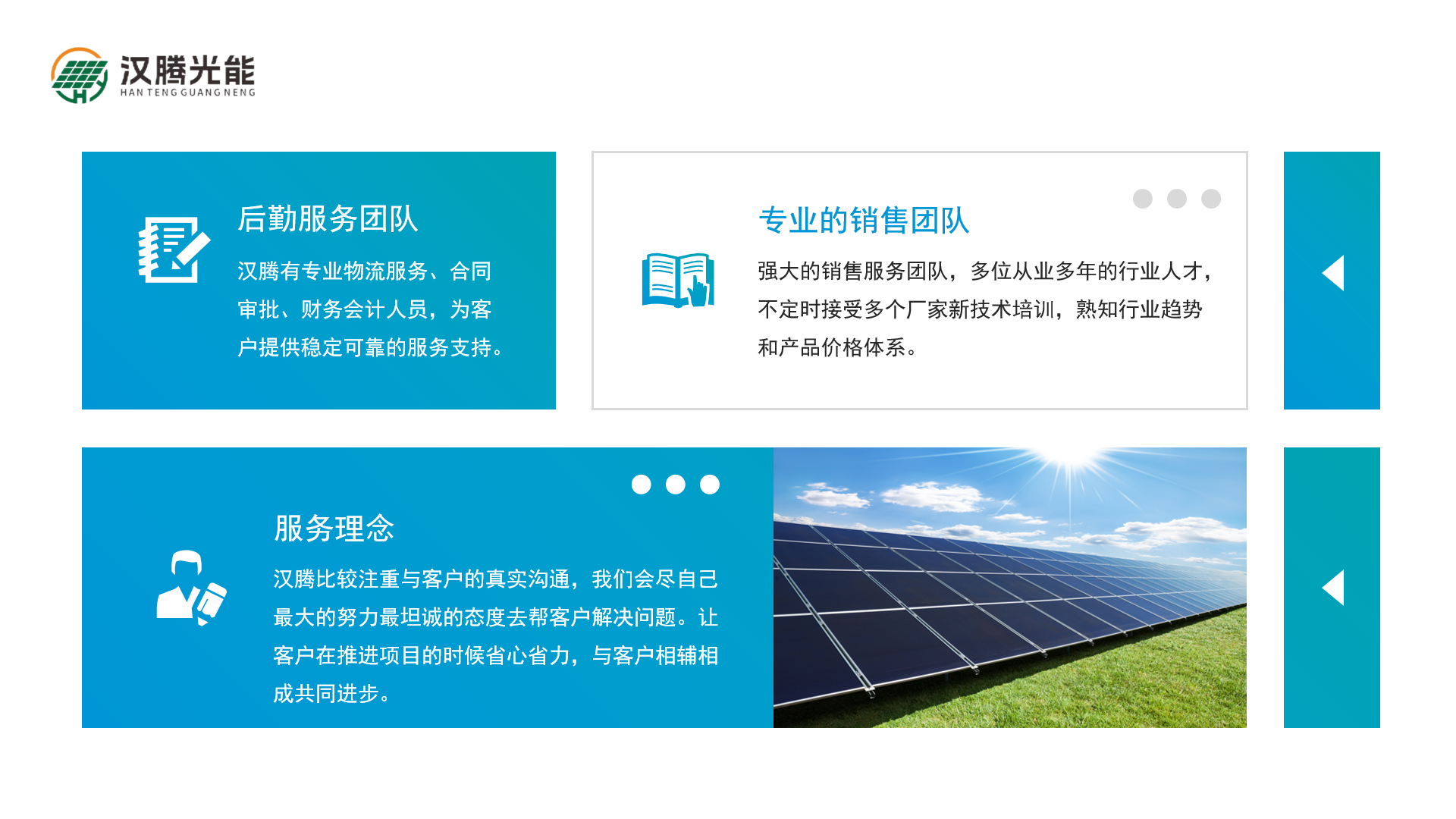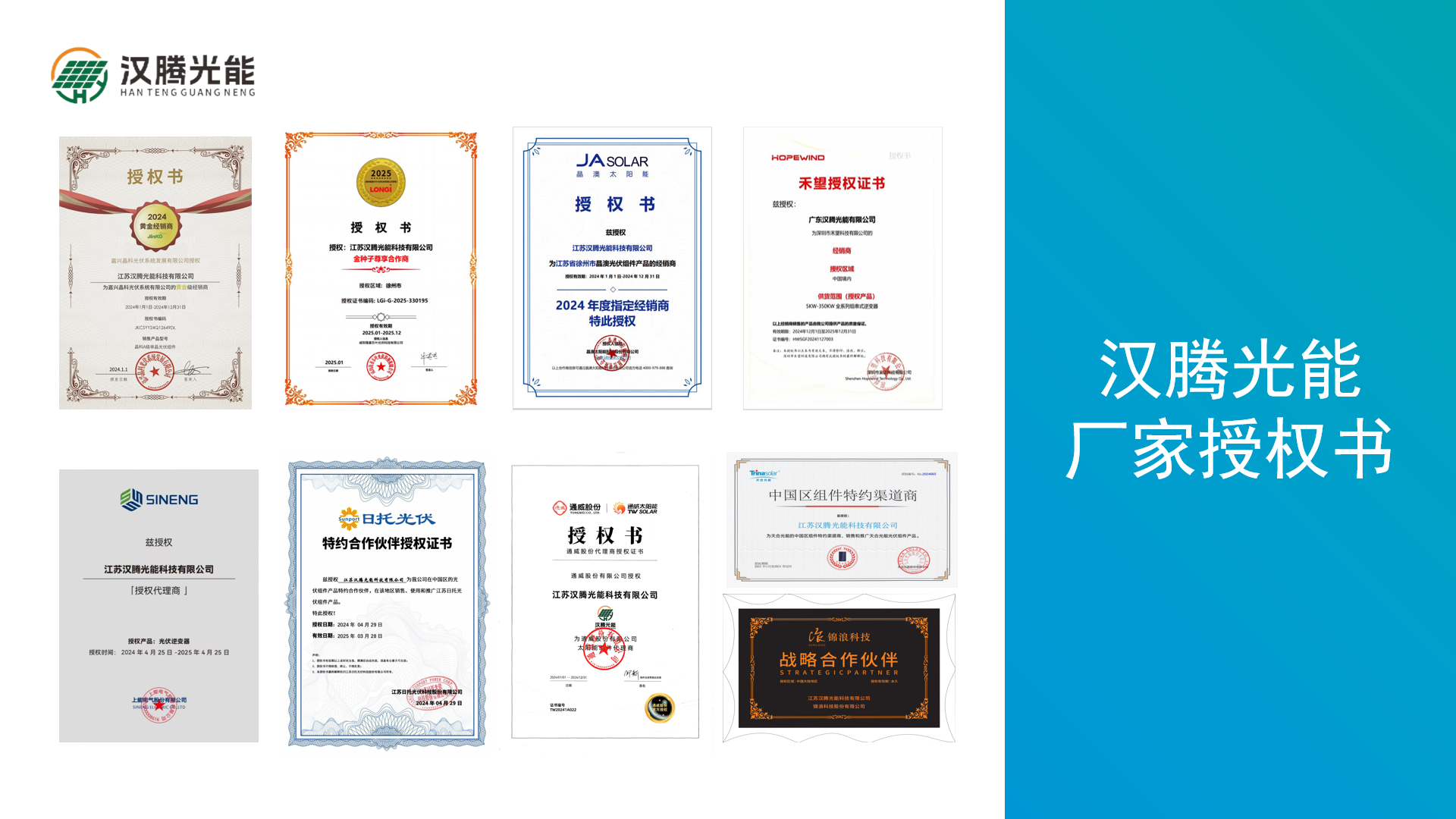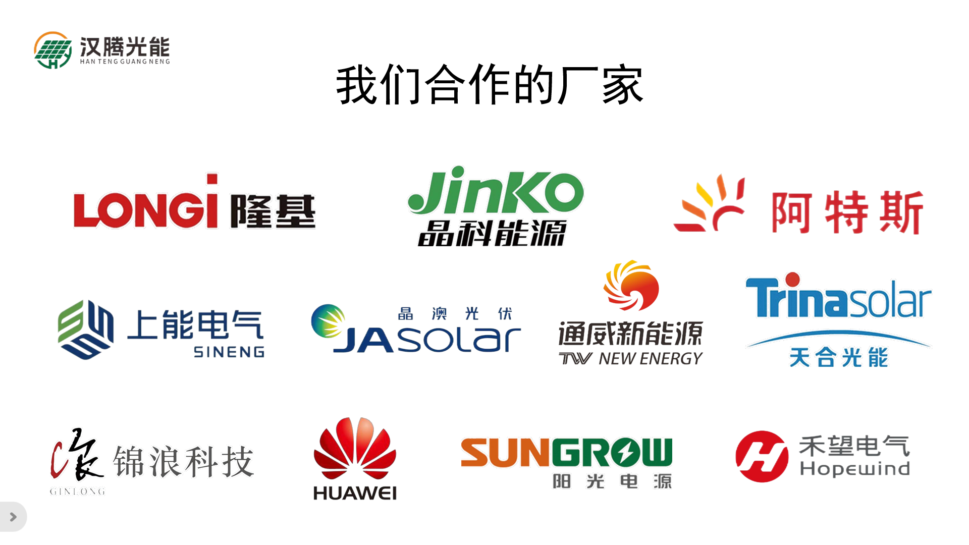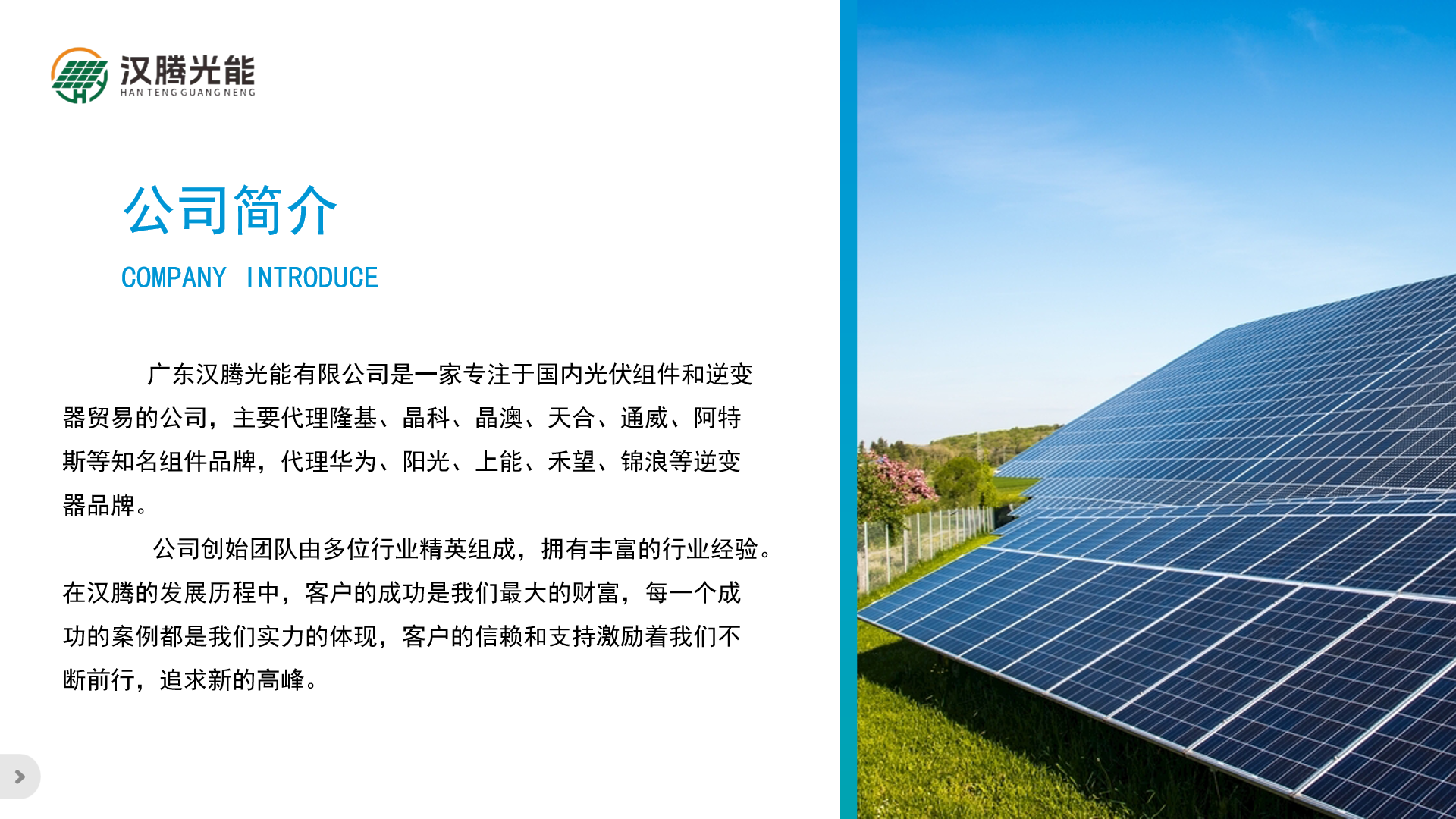 广东汉腾光能有限公司是一家专注于光伏组件和逆变器贸易的公司, 主要代理隆基、晶科、晶澳、天合、通威、阿特斯等知名组件品牌,代理华为、 阳光、上能、禾望、锦浪等逆变器品牌。