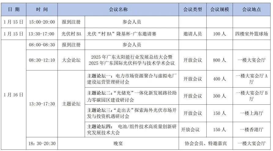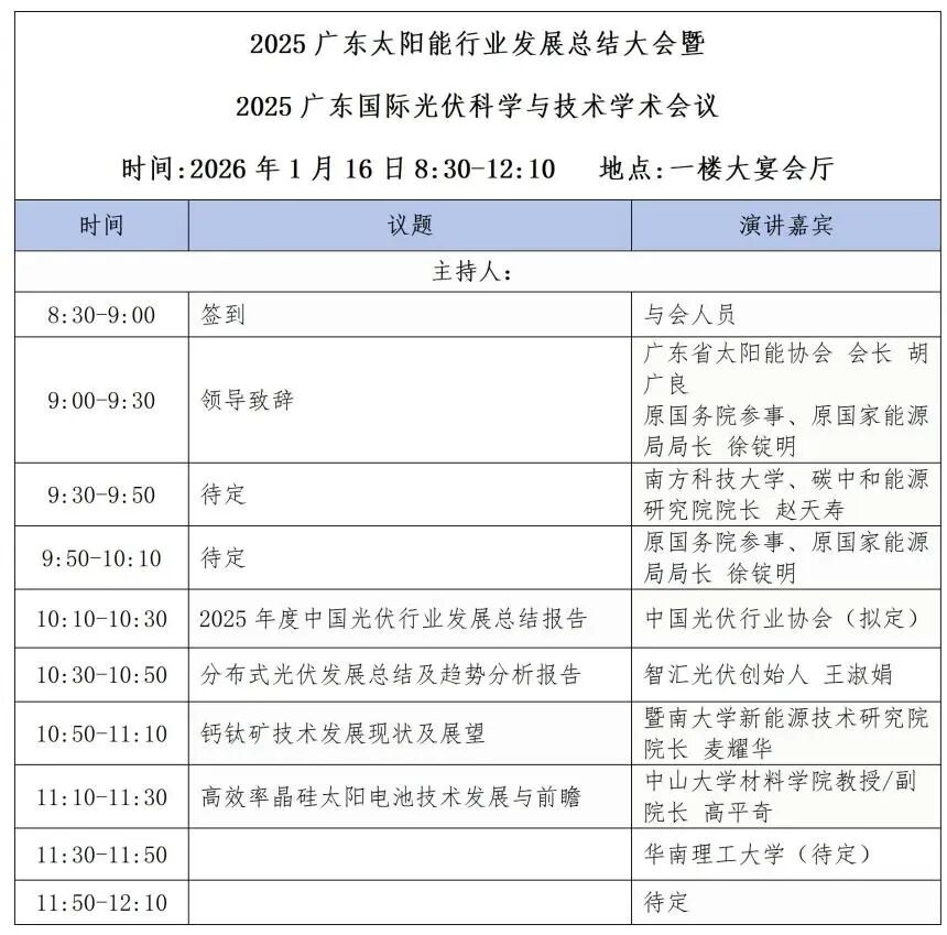 为更好地推动我省太阳能技术和产业的高质量发展,再进一步促进“光储充”一体化、虚拟电厂建设运营发展,引导太阳能光伏技术创新与产学研交流合作,活跃新技术、新理论的交流推广,培育新质生产力,广东省太阳能协会联合广东省能源研究会、中山大学、华南理工大学、暨南大学和南方科技大学于2026年1月16日在广州举办“2025年广东太阳能行业发展总结大会暨2025年广东国际光伏科学与技术学术会议”,同期举办多场多主题论坛,具体方案如下: