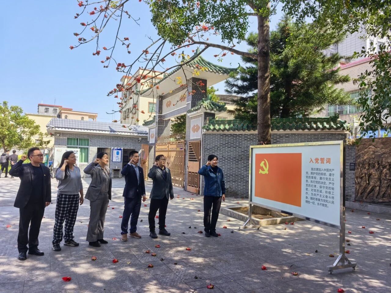 在旧址的庄严氛围中,党员们庄重地重温了入党誓词。面对党旗,声音洪亮地宣誓:“我志愿加入中国共产党,拥护党的纲领,遵守党的章程,履行党员义务,执行党的决定,严守党的纪律,保守党的秘密,对党忠诚,积极工作,为共产主义奋斗终身,随时准备为党和人民牺牲一切,永不叛党。”