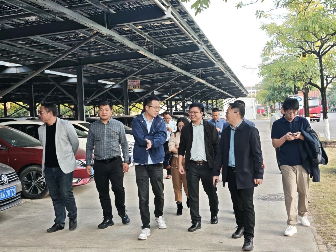 随后前往广州优尼模具科技有限公司光伏车棚+长廊项目实地进行讲解,智都集团相关技术人员向参观学员详细介绍项目亮点和落地过程,细化讲解项目落地难点和解决方案。
