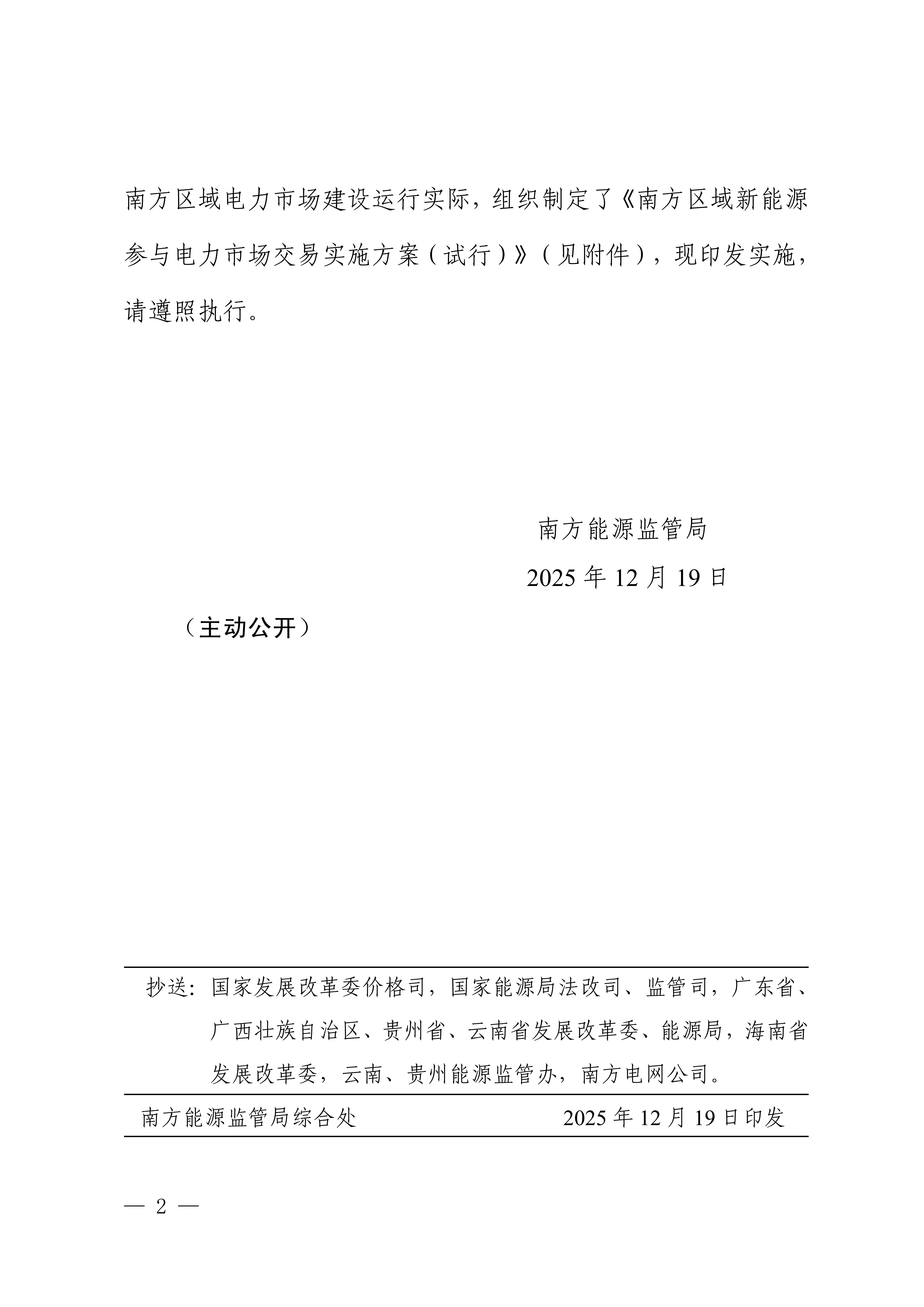 1月4日,国家能源局南方监管局发布关于印发《南方区域新能源参与电力市场交易实施方案(试行)》的通知,通知提出:
